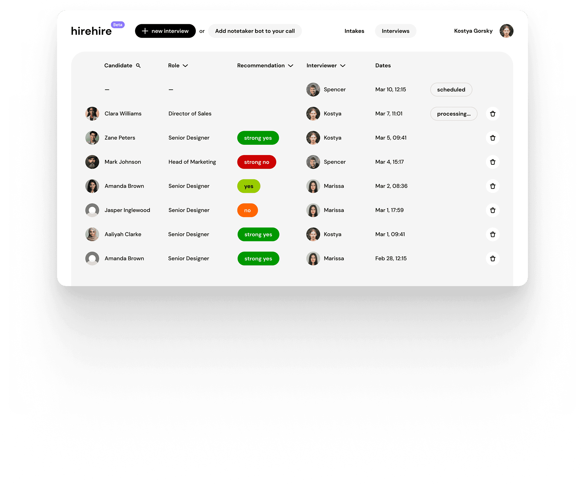 Candidate‑first experience – No more “just to clarify…” emails. Because every salary figure, notice period or nuance is searchable, recruiters rarely circle back to candidates, which helps speed up the hiring process. Сandidates notice the professionalism and speed. At the beginning of each interview, we confirm with candidates whether they are comfortable with using HireHire, and all have responded positively.